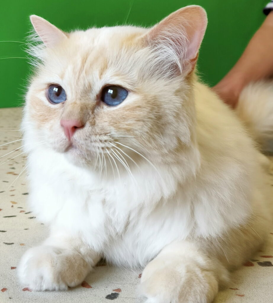 Le birman est un chat à poil mi-long, soyeux et sans sous-poil épais, ce qui limite les nœuds. Il est reconnaissable à ses yeux bleu saphir, à son masque coloré (colorpoint) et surtout à ses pattes blanches bien marquées appelées « gants », symétriques sur les quatre membres. Les couleurs classiques incluent seal, blue, chocolate, lilac, red et cream, parfois avec des variations tabby ou tortie.
